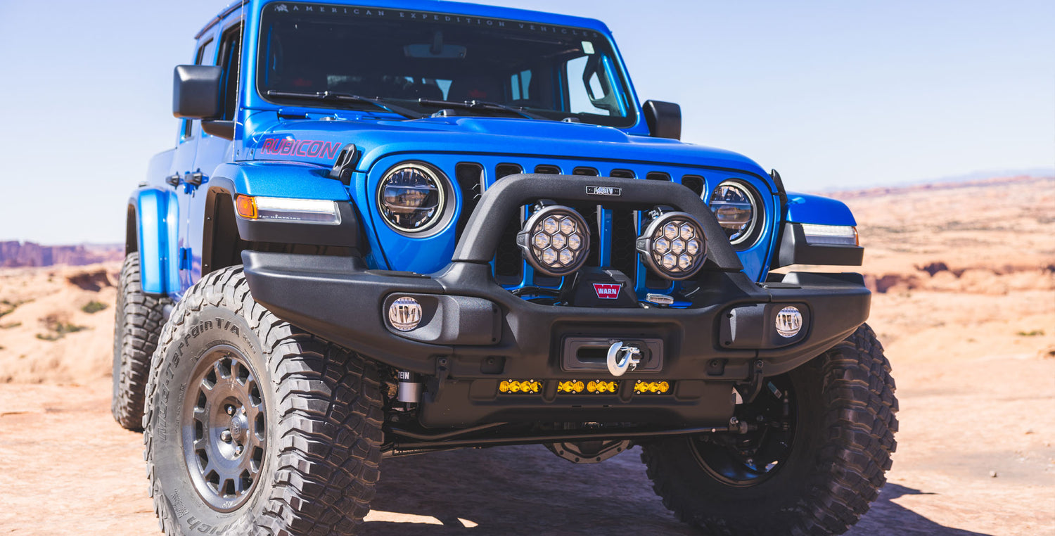 AEV’s stamped steel Front Bumper for the JT Gladiator provides superior front end protection, two chassis mounted recovery points and an integrated lower skid plate. Shown with Warn Zeon 10-S Winch and AEV Hawse Fairlead (Winch is optional on JT350 & JT370).