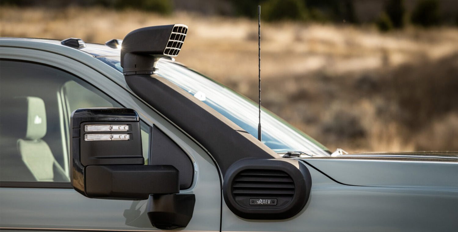 Manufactured in the USA out of UV-stable cross-linked polyethylene, the AEV Snorkel delivers improved engine performance by drawing in the cleanest, coolest air charge possible—even in the worst conditions off-road.