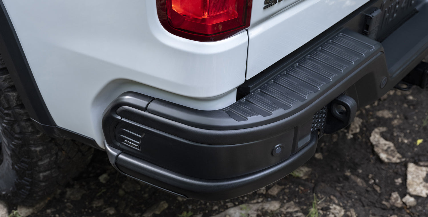 The AEV Rear Bumper provides enhanced protection, recovery options, and a rugged aesthetic. It features integrated corner steps for easy access to the truck bed and reinforced mounting points for D-rings.