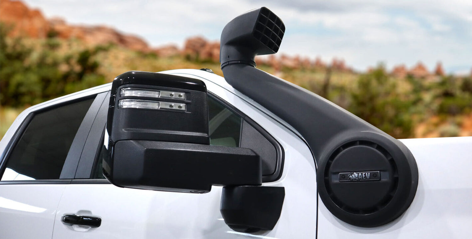 Manufactured in the USA out of UV-stable cross-linked polyethylene, the AEV Snorkel delivers improved engine performance by drawing in the cleanest, coolest air charge possible—even in the worst conditions off-road.