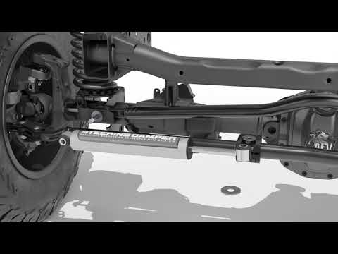 - Moves the Jeep’s steering damper from the stock OE position to up above the tie rod. The new position will help protect the damper from being damaged while driving over rough terrain.